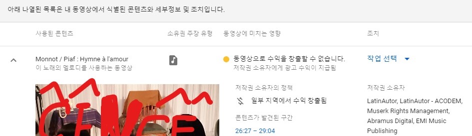 오른 쪽 끝의 작업선택은 곡을 활용한 유튜버가 취하는 조치로 '구간 자르기', '곡 바꾸기' 그리고 '음소거' 가 있습니다.유튜브의 음성인식기술이 26:27-29:04 구간에서 '사랑의 찬가'를 인식했나봅니다(인식 결과가 자동으로 침해자에게 통보되는 시스템입니다). 저작권 소유자로 EMI Music Publishing 등의 뮤직 퍼블리셔(음악출판사)가 있습니다. 뮤직 퍼블리셔는 작곡가 작사자의 저작권을 대행 관리하는 회사로, 이에 대해서도 다음 기회에 말씀드릴께요.