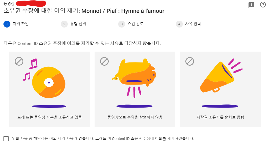 콘텐츠아이디 소유권 주장에 이의제기를 하면 위와 같은 화면이 뜨는데요. 1) CD 또는 DVD 또는 노래를 구매한다고 하여 동영상에서 이를 사용할 권리가 부여되지는 않는다는 점, 2) 동영상으로 수익을 창출하지 않더라도 해당 자료를 사용하려면 저작권 소유자의 허가를 받아야 할 수 있다는 점, 3) 동영상 또는 설명에 면책조항을 게시해도 저작권 보호 자료를 사용할 권한이 부여되지 않는다는 점을 잘 이해해두시길 바랍니다. 이의제기 절차 전반에 대해서도 다음에 다루도록 하지요.
